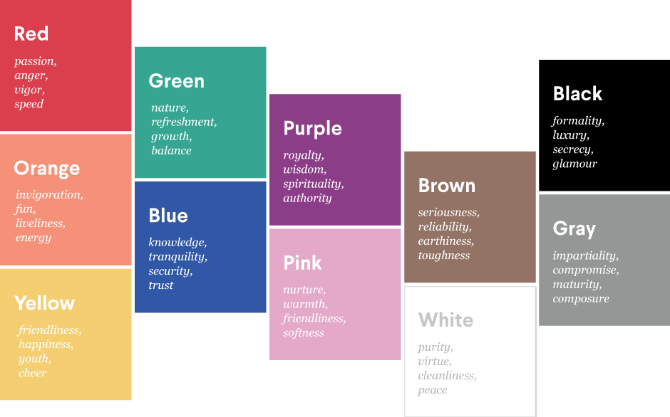 Выбор правильного доминирующего цвета для вашего бренда имеет решающее значение. Этот цвет должен отображаться на всех ваших рекламных материалах, включая ваш логотип и упаковку продукта. Насколько это возможно, цвет, который вы выбираете, должен выделять вас, работать с вашей отраслью и имиджем, а также соответствовать обещаниям вашего бренда. Следует также учитывать психологию цвета, которая довольно сложна. Цвета могут означать разные вещи в зависимости от культуры, ситуации и отрасли. Однако, по крайней мере в американской рекламе, исследования предлагают несколько универсальных значений: