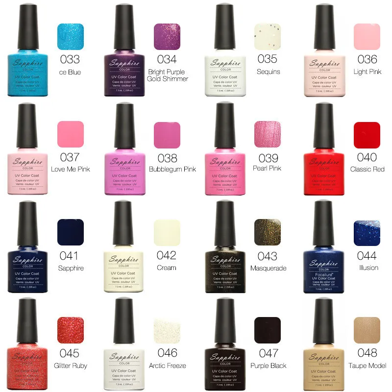 Палитра цветов представлена у каждого продавца своя. Номер цвета указан на баночке с гель лаком, так что сложностей с выбором не будет.