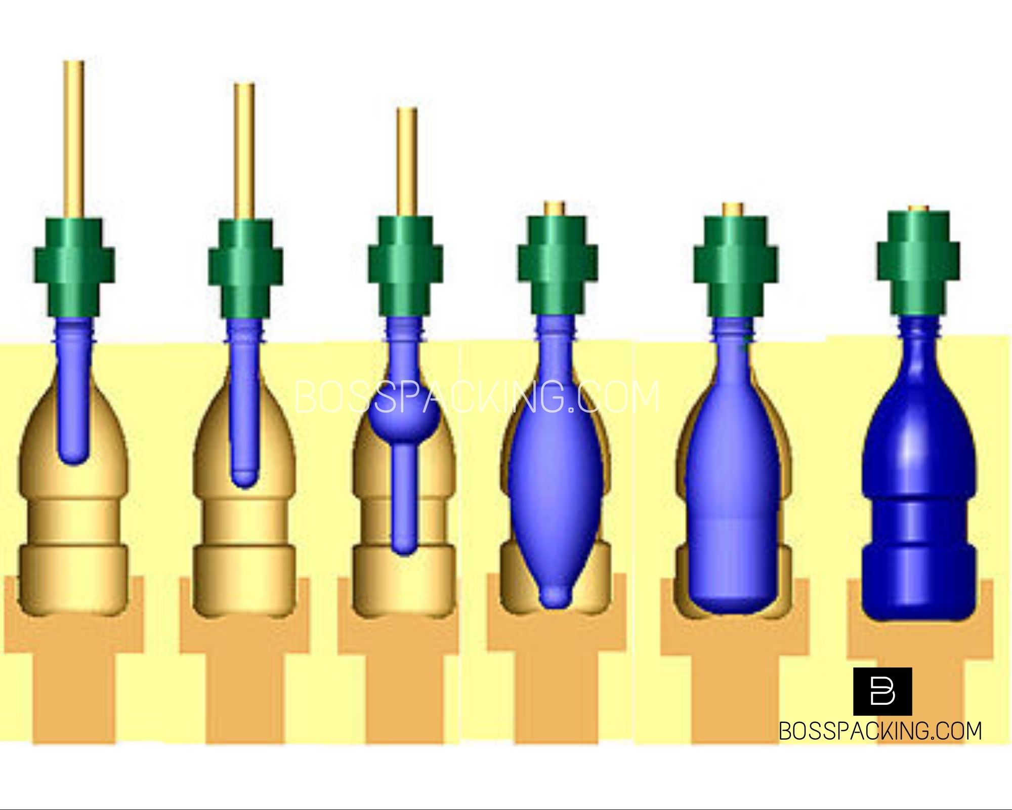 - Для изготовления полых предметов путем выдавливания пластика в камеру, которая выдувается наружу, чтобы принять форму полости пресс-формы пластикового контейнера.
